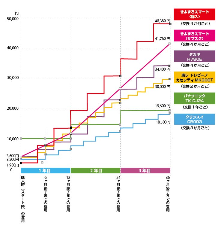 • 3年後:きよまろスマート 48,380円 vs クリンスイ 18,500円(約2.6倍の差!)